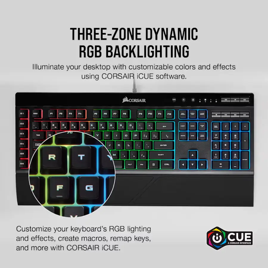 Transforma tu escritorio con la impresionante retroiluminación RGB dinámica de cinco zonas del K55 Pro. Personaliza tu equipo con seis efectos de iluminación preestablecidos, asigna colores individuales a cada zona o crea tus propios efectos vibrantes utilizando el potente software CORSAIR iCUE. Sumérgete en la atmósfera de tus juegos con perfiles como Pulsación, Cambio de color, Ola de color y Ola arcoíris.